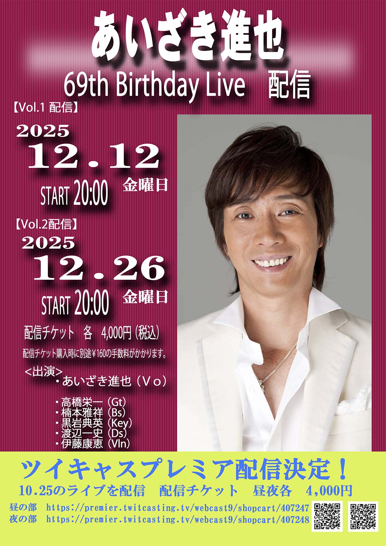 あいざき進也 69th Birthday Live 配信 Vol.1・あいざき進也(Vo)・高橋栄一(Gt)・楠本雅祥(Bs)・黒岩典英(Key)・渡辺一史(Ds)・伊藤康恵(Vln)2025/12/12 20:00 Start■視聴料 4...